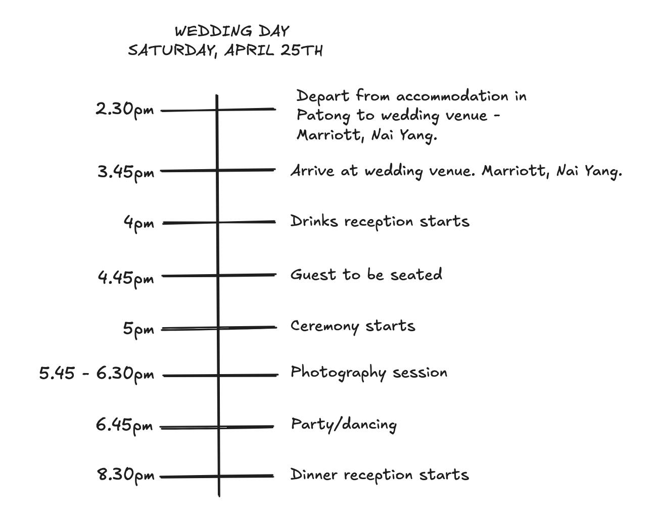 A: We kindly ask that you arrive no later than 3:45 PM on April 25, 2026 at The Marriott, Nai Yang.Q: What is the wedding schedule?