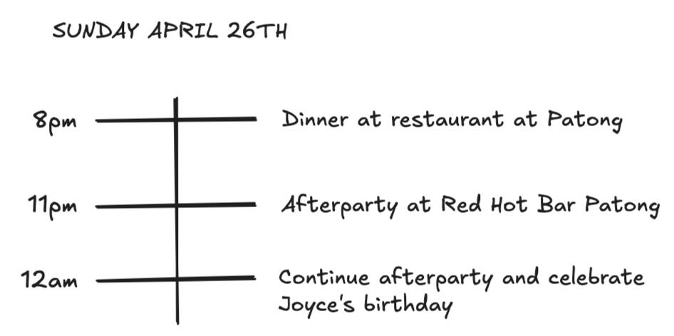 A: We kindly ask that you arrive no later than 3:45 PM on April 25, 2026 at The Marriott, Nai Yang.Q: What is the wedding schedule?